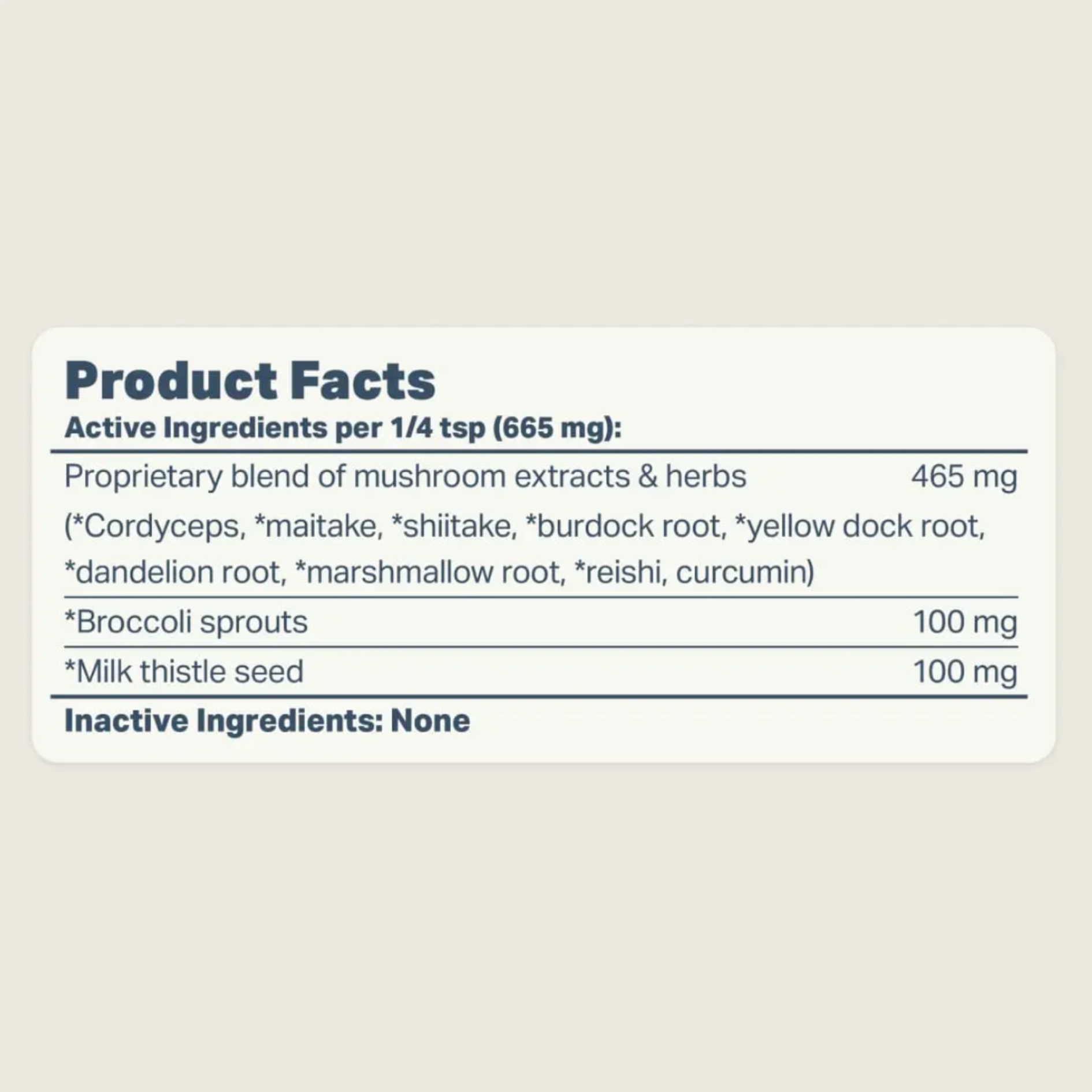 - Organic Broccoli Sprout Powder: naturally high in sulforaphane to help the liver break down harmful heavy metals and environmental toxins.