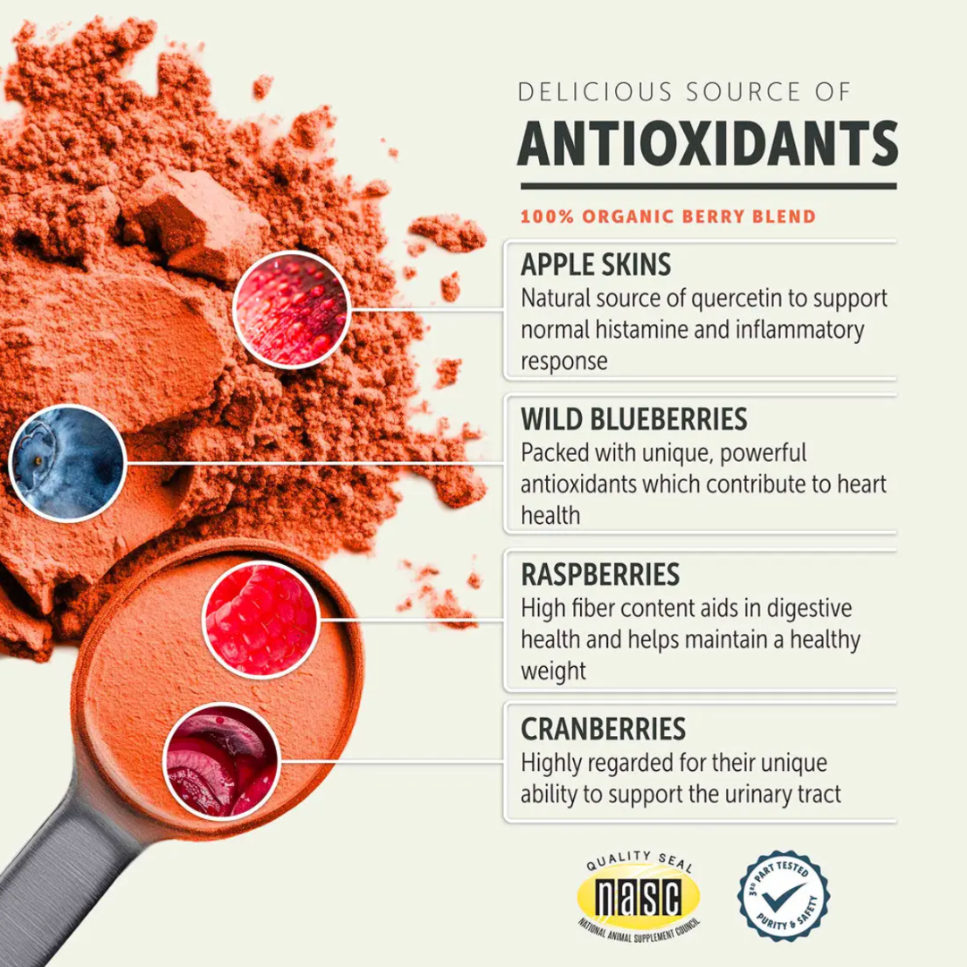 Because it’s a powder, you get the benefits of fresh organic fruit without the cost, mess or waste. Fresh berries are never “out of season” for your dog.