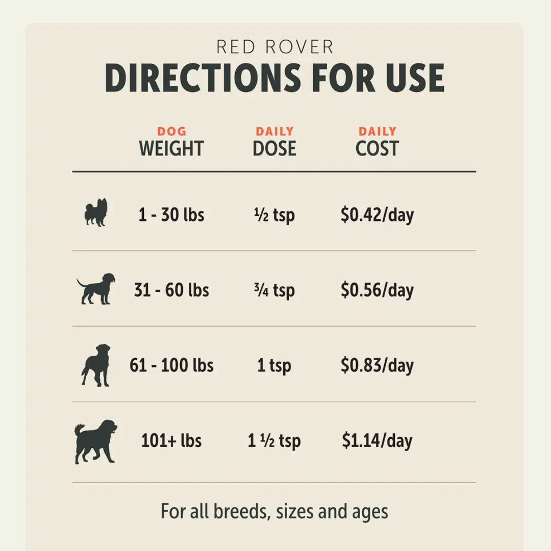 Simply sprinkle Red Rover over your dog's meals daily. Daily amount can be split across multiple meals. Adjust as needed based on your dog’s individual needs. For dogs of all ages.